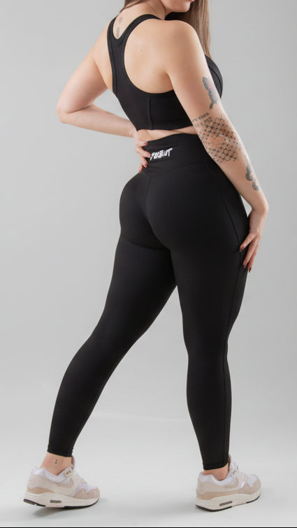 El diseño ribeteado aporta textura y soporte, mientras que los bolsillos laterales funcionales en los leggings añaden practicidad sin sacrificar estilo. Ideal para entrenamientos, yoga o para tu día a día activo.