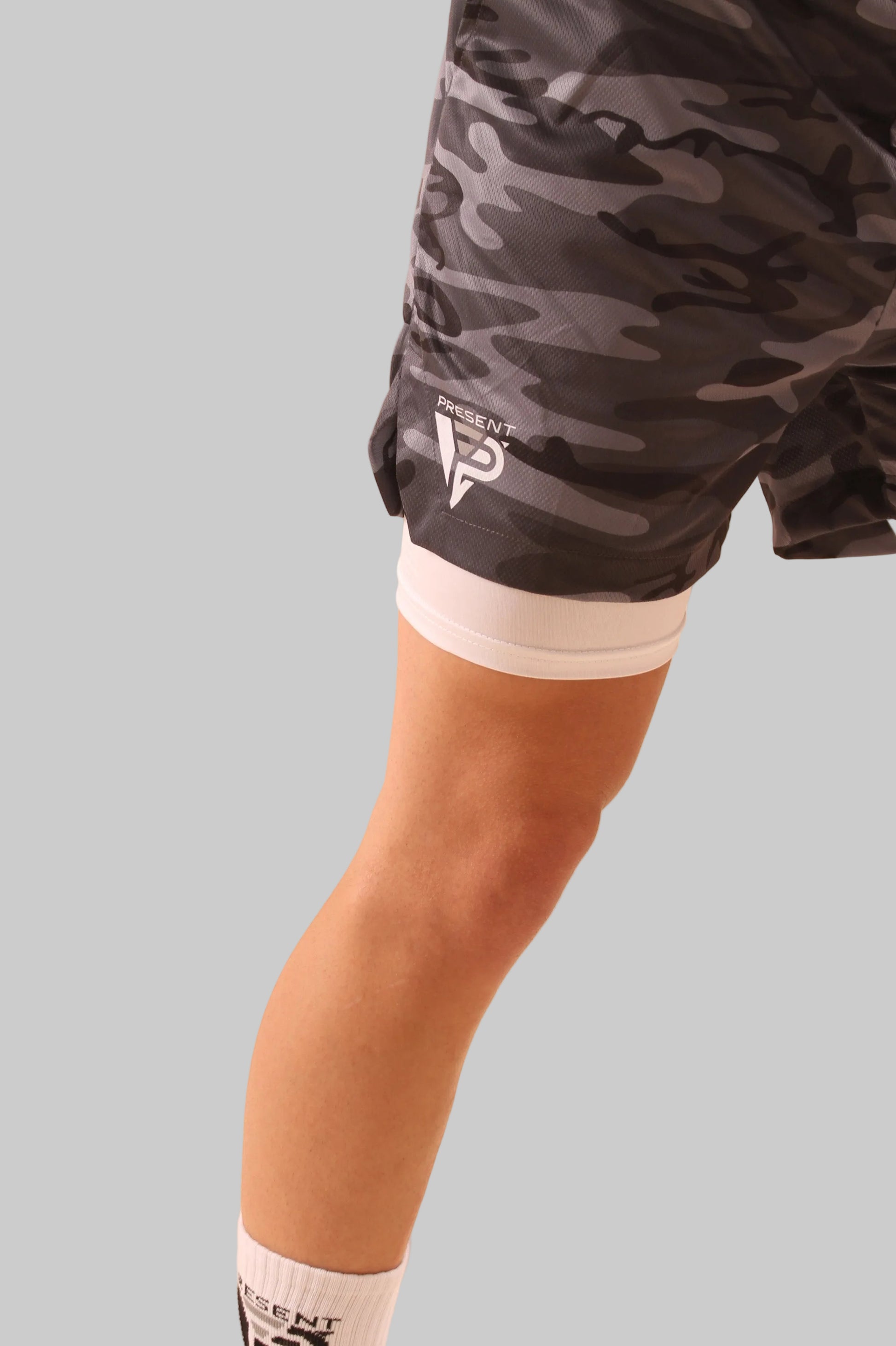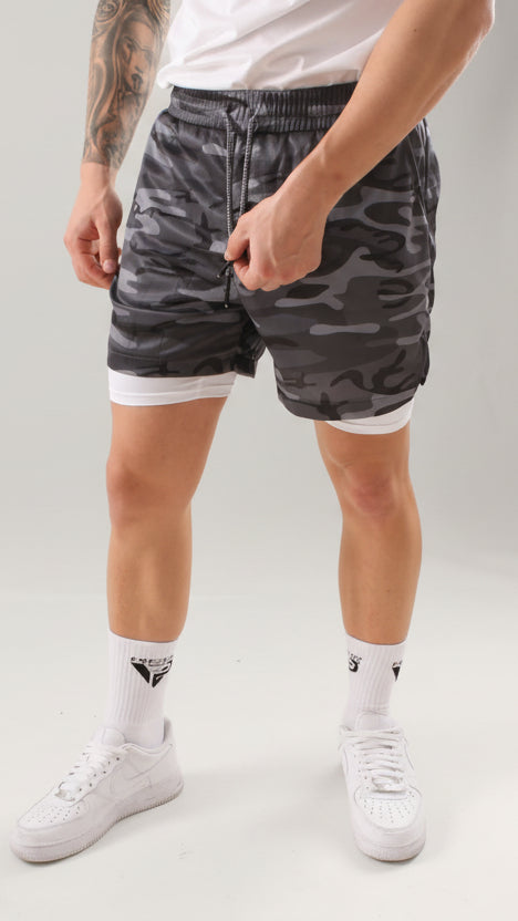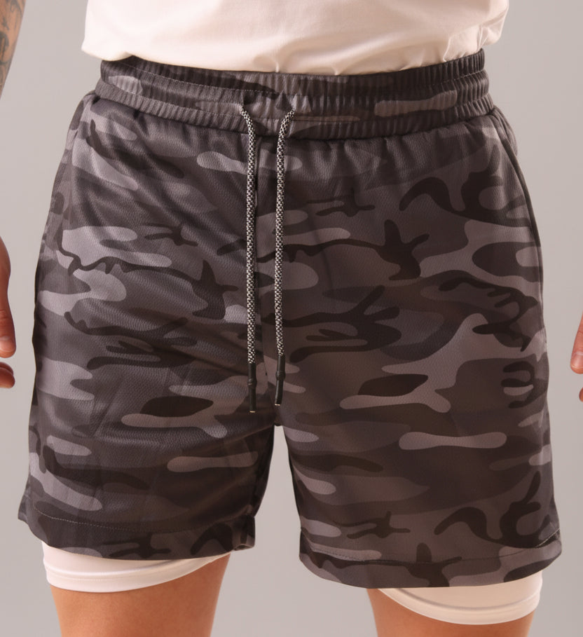 Diseño 2 en 1: Short exterior con estampado camuflado + malla interior ajustada para soporte muscular y libertad de movimiento.